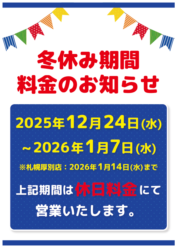 いつも当施設をご利用いただきましてありがとうございます。 2025/12/24(水)~2026/1/7(水)の期間中、休日料金にて営業いたします。※札幌厚別店:2026/1/14(水)まで ※店舗ごと…